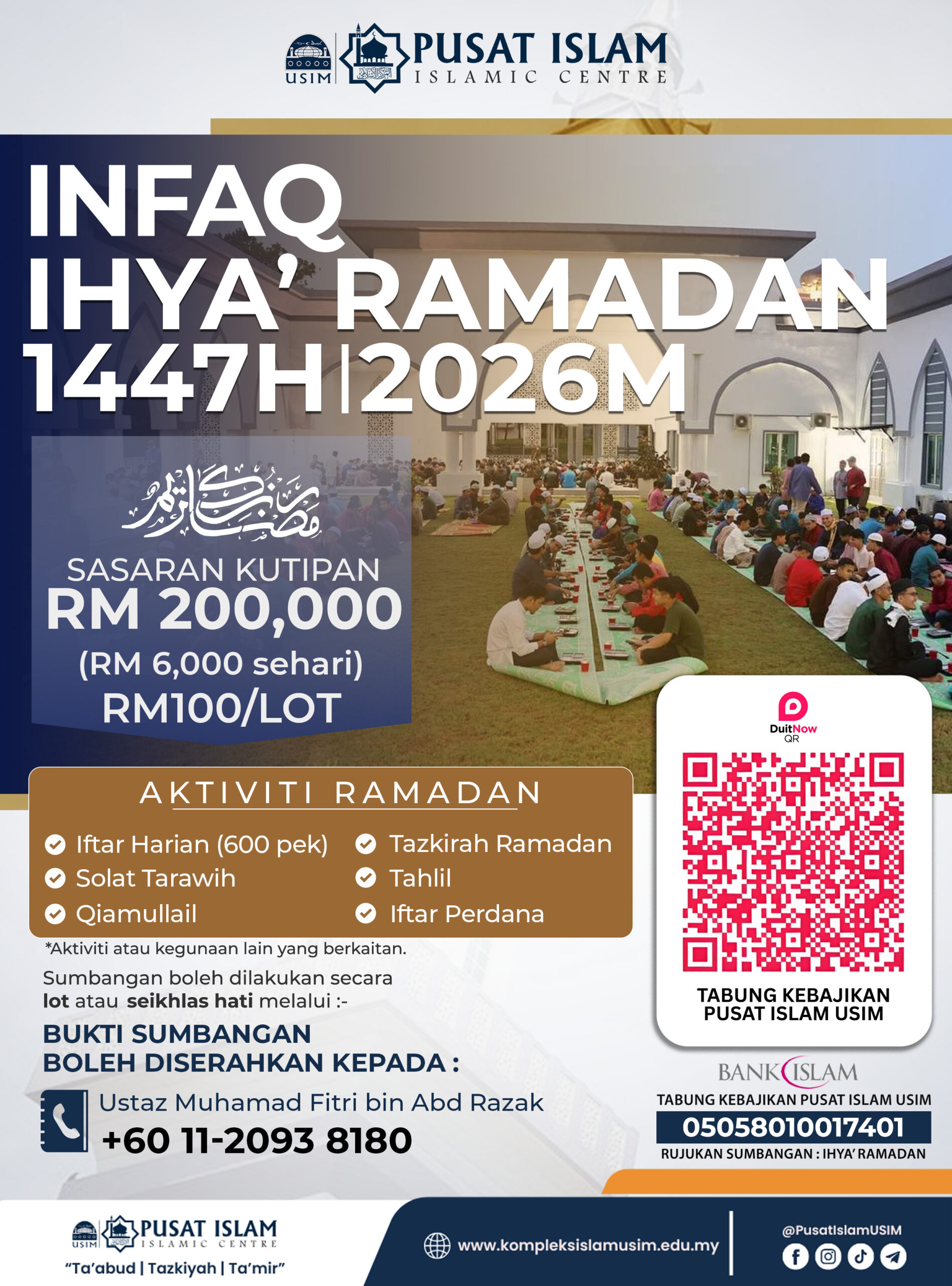 Pusat Islam, Universiti Sains Islam Malaysia (USIM) dengan rendah hati mempelawa seluruh warga kampus, alumni serta masyarakat umum untuk bersama-sama menyumbang dalam Program Infaq Ihya’ Ramadan 1447H / 2026M.